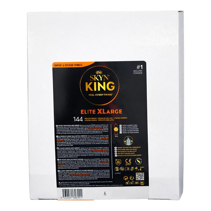 Packung Kondome Manix Skyn King Size, speziell für grosse Penisse entwickelt. Diese Kondome sind besonders dünn und bestehen aus latexfreiem SkynFeel-Polyisopren. Nahezu kaum wahrnehmbares Kondom, das das Gefühl vermittelt, nichts zu tragen! Erhältlich in Packungen mit 14, 20 oder 144 Kondomen.