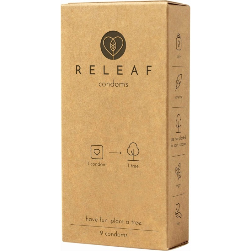 Pack of 9 Releaf vegan condoms designed in a fair way. Made using natural latex from sustainable agroforestry. With Releaf, you can enjoy effective protection during sex, while at the same time doing good for the environment and increasing your environmental awareness.