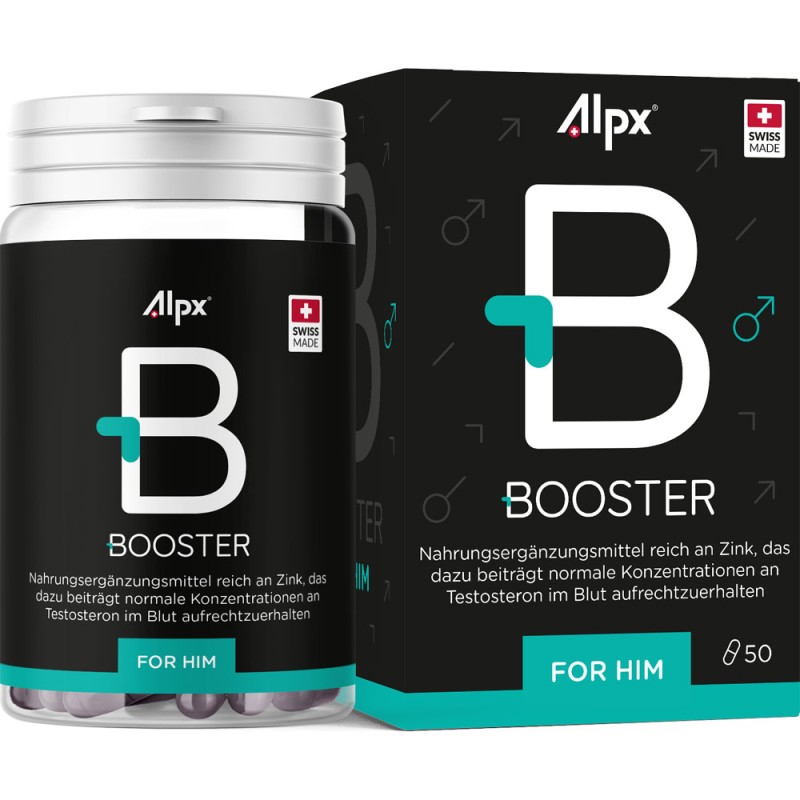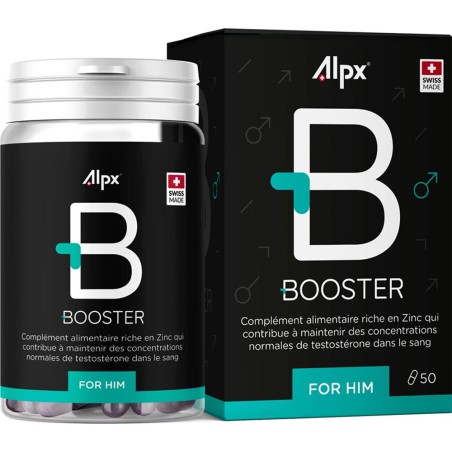 Complément alimentaire pour homme Alpx Booster for HIM contribuant à maintenir des concentrations normales de testostérone dans le sang et à dynamiser la vie sexuelle. À base de plantes, d’arginine et de zinc, élaboré en Suisse et disponible en paquet de 50 capsules.