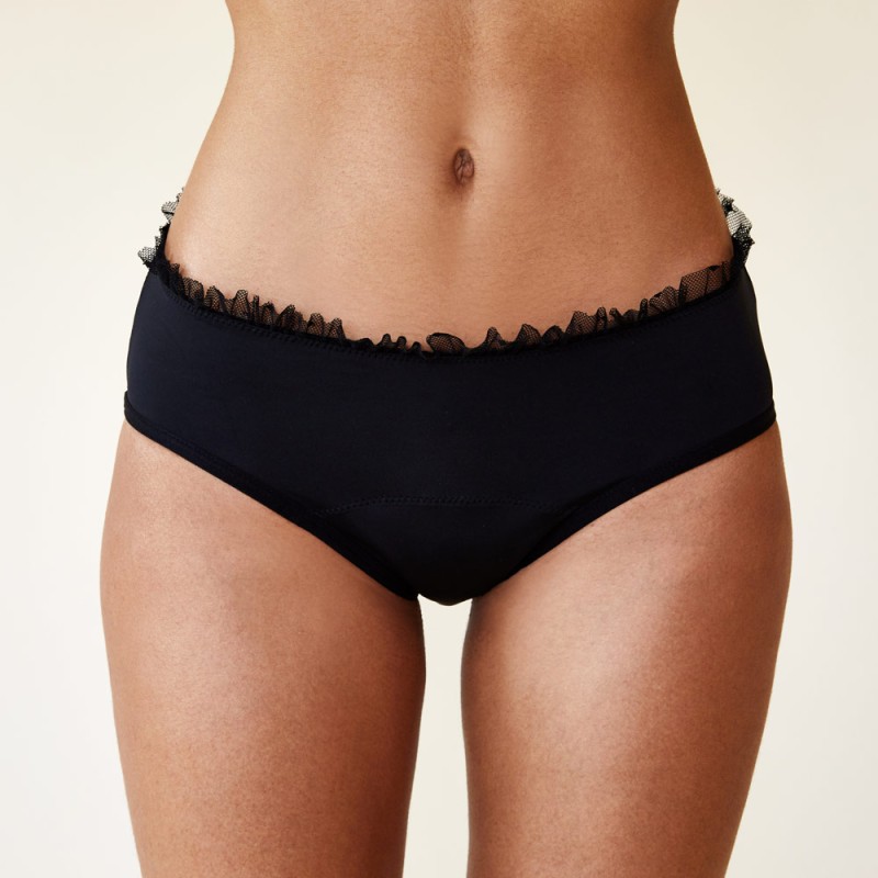 Priva di sostanze chimiche e perfettamente impermeabile, evita le perdite, l'umidità e i cattivi odori. Lavabile in lavatrice, questa raffinata lingerie si contraddistingue anche per il suo colore nero e il suo volant in plumetis in vita che vi offrirà un comfort incomparabile e un look sexy, anche durante le mestruazioni.